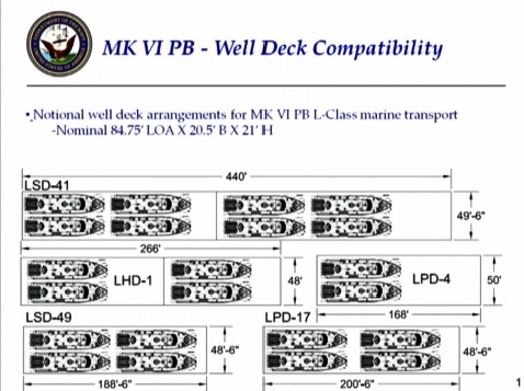 The above graphic shows how 4 MKVI patrol boats can be transported inside the well deck of either a LHD-1, LPD-17, or LSD-49 class amphibious warfare vessels. Even the older LPD-4 types can carry a pair of the super swifts. The huge LCAC-designed well-deck of the LSD-41 type landing docks can carry an entire expeditionary squadron of 8 MkVI boats inside her hull. Couple this with berthing for brown water sailors, flight deck spots for SH/MH60 helicopters and UAVs and you see how a group of MKVIs can be UPS’d to a contested strip of coastline.