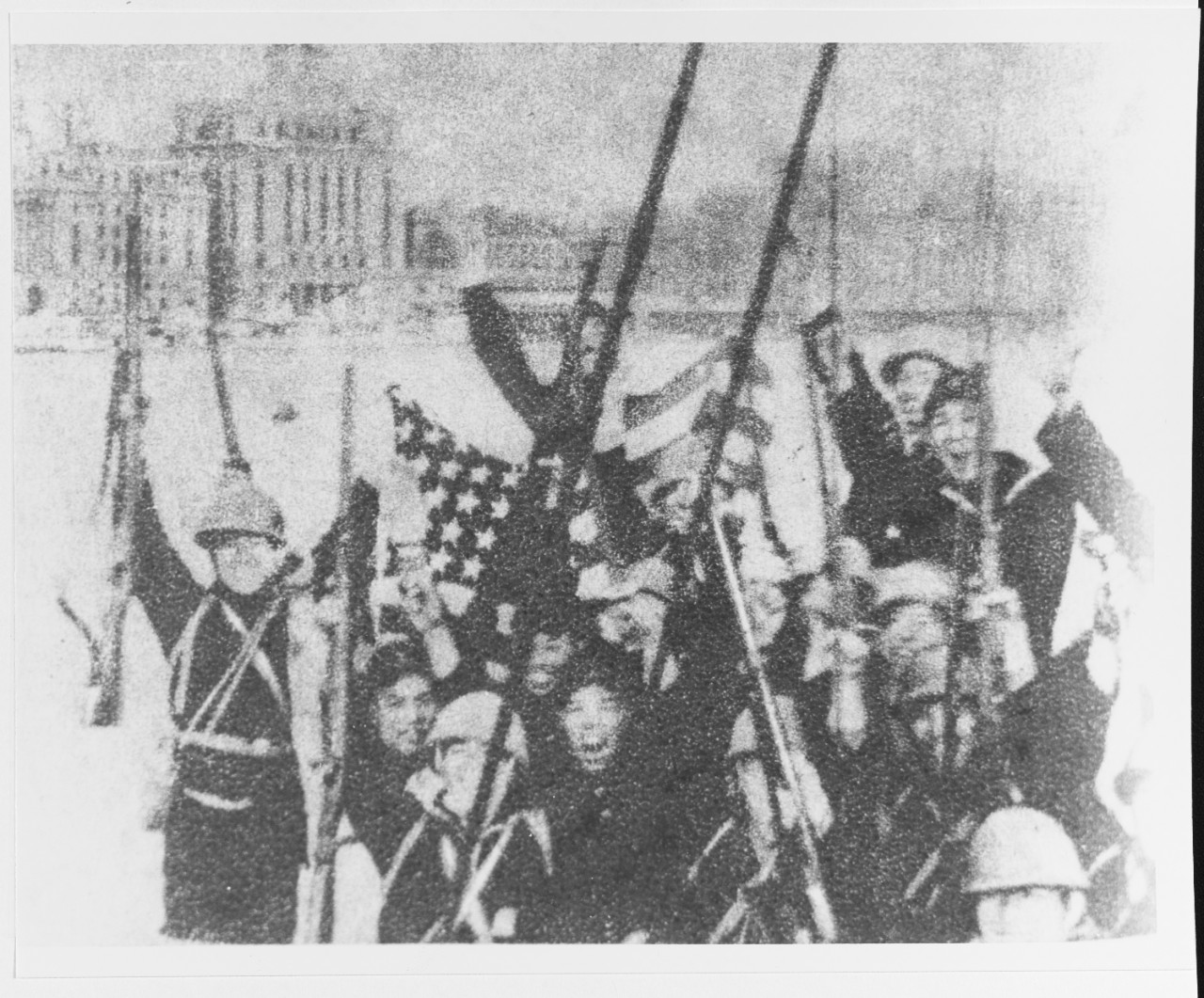 Capture of USS WAKE (PR-3), 8 December 1941 Japanese special naval landing force personnel celebrate after they captured USS WAKE on the first day of World War II in the Pacific. The Shanghai “Bund” is in the background. Description: Courtesy of the Naval Historical Foundation. Catalog #: NH 96568