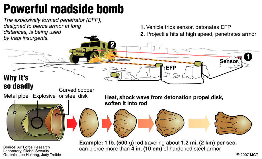 Interesting series of infographics about just what is an improvised EFP. An explosively formed penetrator (EFP), also known as an explosively formed projectile, a self-forging warhead, or a self-forging fragment, is a special type of shaped charge designed to penetrate armor effectively at standoff distances. As the name suggests, the effect of the explosive charge is to deform a metal plate into a slug or rod shape and accelerate it toward a target