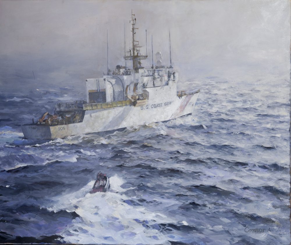 In this work from the U.S. Coast Guard Art Program 2014 Collection, “Above the Seneca,” ID# 201404, the USCGC Seneca (WMEC 906) patrols in the Straits of Florida. Homeported in Boston, the Seneca’s missions range from protecting and enforcing laws for living marine resources to deploying in support of joint agency intercepts of drug smugglers in the Caribbean Sea. U.S. Coast Guard Art Program work by James Consor.