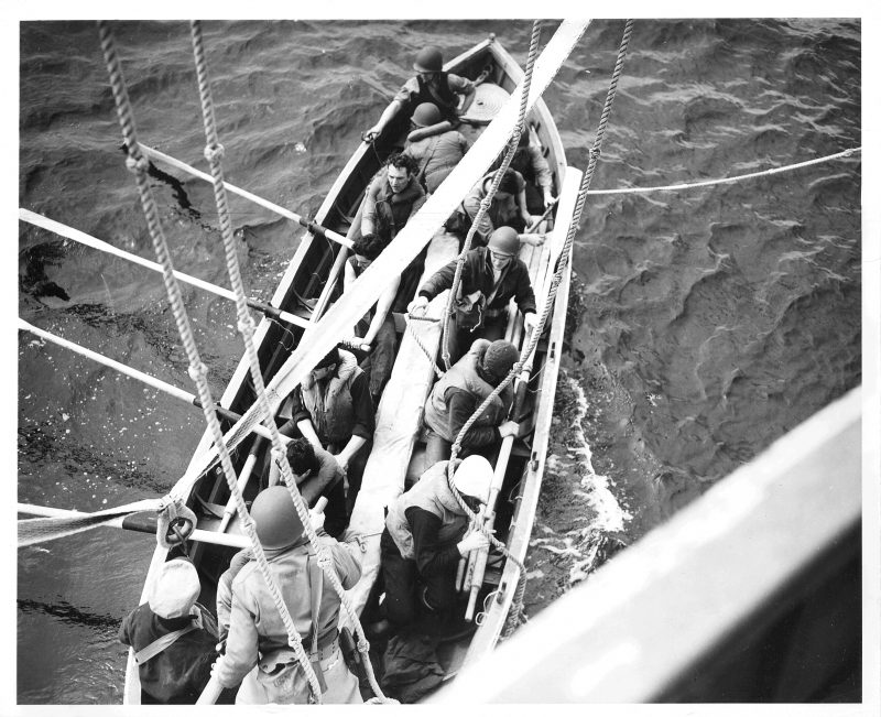 Official Caption: “OFF TO RESCUE THEIR BEATEN FOES: A pulling boat leaves the side of a Coast Guard combat cutter to rescue Nazi seamen struggling in the mid-Atlantic after their U-Boat had been blasted to the bottom by the cutter’s depth charges. Two Coast Guard cutters brought 41 German survivors to a Scottish port.” Date: 17 April 1943 Photo No.: 1516 Photographer: Jack January Description: The men in this pulling boat were in fact a trained boarding team led by LCDR John B. Oren (standing in the stern and wearing the OD helmet) and LT Ross Bullard (directly to Oren’s left). With the assistance of the Royal Navy they had practiced boarding a submarine at sea in order to capture an Enigma coding machine and related intelligence material. They were forced to take a pulling lifeboat when the Spencer’s motor lifeboat was damaged by friendly fire.