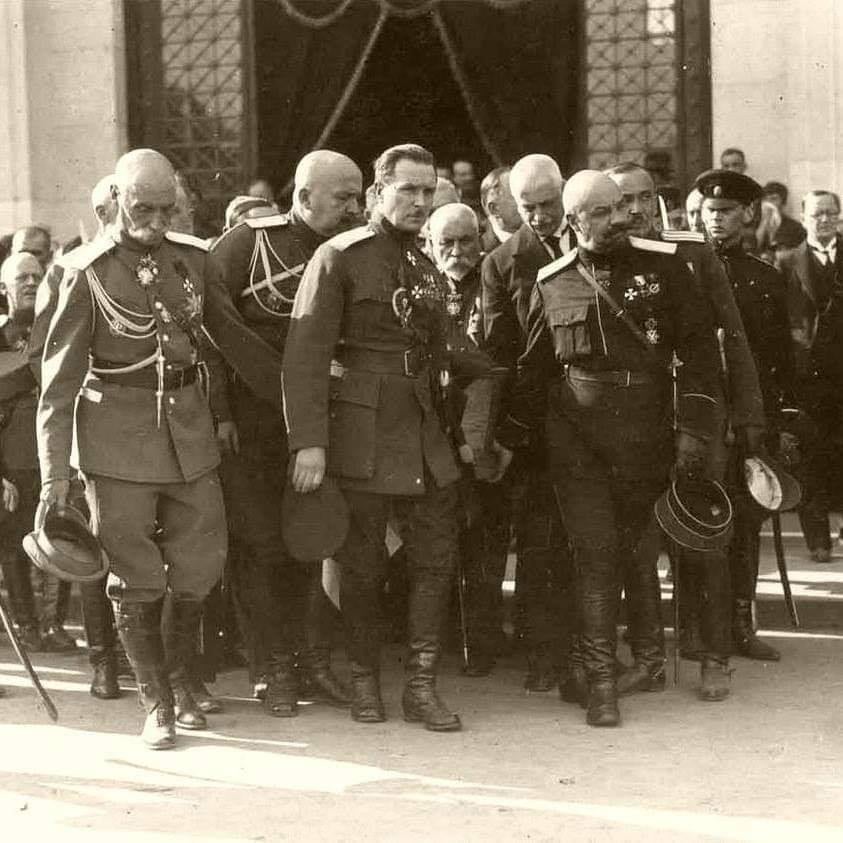 Colleagues carry a coffin with the body of General Wrangel. General Alexander Kutepov is in the foreground. The furthest (smallest) General V. In. Marushevsky. General A on the left. A. Zegelov, General AA von Lampe. General PN Chatilov. General AP Kutepov. Colonel Elatoncev.