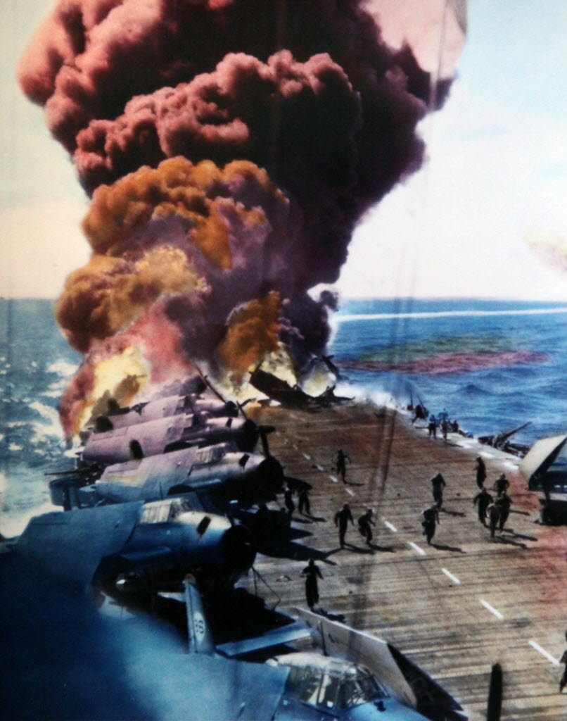 USS Belleau Wood (CVL-24) burning aft after she was hit by a Kamikaze, while operating off the Philippines on 30 October 1944. Flight deck crewmen are moving undamaged TBM torpedo planes away from the flames as others fight the fires. USS Franklin (CV-13), also hit during this Kamikaze attack, is afire in the distance. Official U.S. Navy Photograph, now in the collections of the National Archives. (Photo # 80-G-342020).FromNavsource.