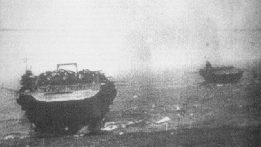 Kaga steams through heavy north Pacific seas, enroute to attack Pearl Harbor, Hawaii, circa early December 1941. Carrier Zuikaku is at right. Frame from a motion picture film taken from the carrier Akagi. The original film was found on Kiska Island after U.S. recapture in 1943. U.S. Naval History and Heritage Command Photograph.