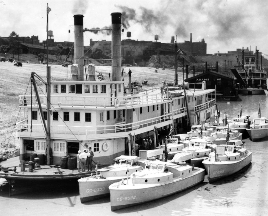 A dozen Coast Guard picket boats muster beside the former CGC Yocona on the Mississippi River during The Great Ohio, Mississippi River Valley Flood of 1937 http://coastguard.dodlive.mil/2011/06/the-great-ohio-mississippi-river-valley-flood-of-1937/ . U.S. Coast Guard photo. Yocona was a 182-foot Kankakee-