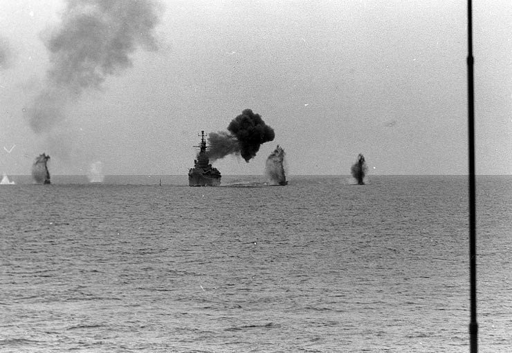 USS Saint Paul bombarding the Cong Phy railroad yard 25 miles south of Thanu Hoa, Vietnam, 4 Aug 1967; note splashes from coastal gun batteries