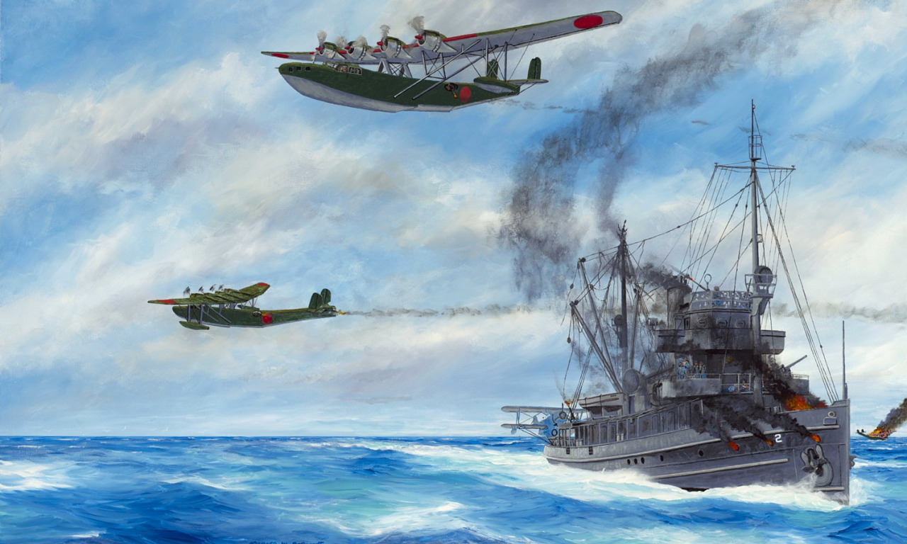 “Evasion of Destruction” by Richard DeRosset portrays a strafing run by three Japanese “Mavis” flying boats following their unsuccessful torpedo attack on the USS Heron (AVP-2) on 20 December 1941. Heron shot down one of the aircraft with her starboard 3-inch gun; her port gun had been disabled by earlier combat action. This final attack followed a series of earlier ones by twelve other enemy aircraft against the seaplane tender as she sailed alone in the Java Sea. Due to heroic actions by her captain and crew, Heron survived seemingly overwhelming odds during the long ordeal. Heron had approximately 26 casualties, or about 50 percent of the crew, because of the attack.