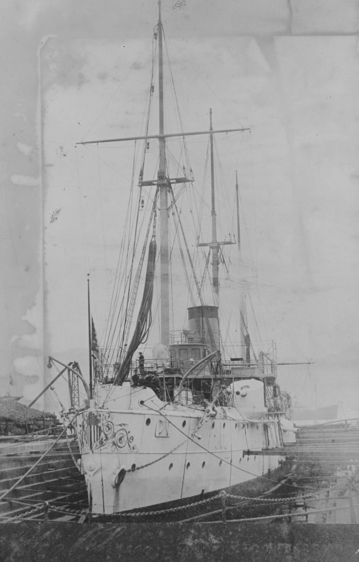 (Gunboat # 4) In the Kowloon, dry dock, Hong Kong, China, in 1901. Collection of Chief Boatswain’s Mate John E. Lynch, USN. Donated by his son, Robert J. Lynch, in April 2000. U.S. Naval History and Heritage Command Photograph. Catalog #: NH 102766