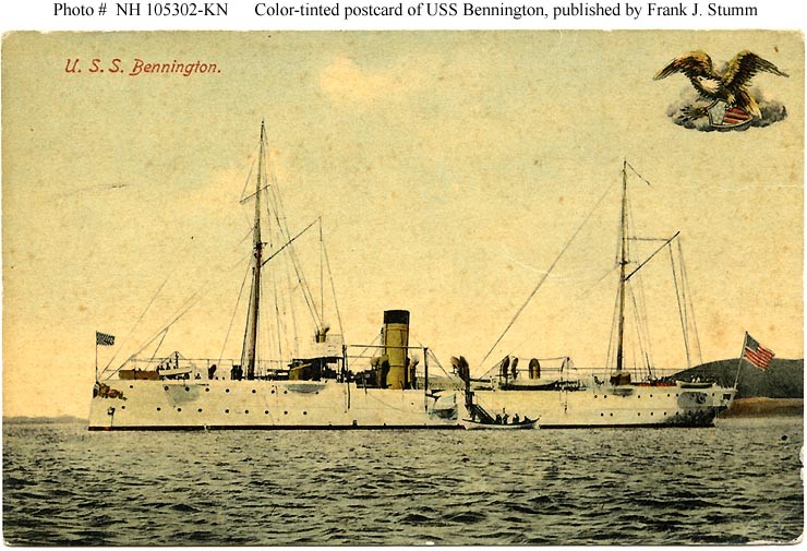 USS Bennington (Gunboat # 4) At anchor, probably in San Francisco Bay, California, circa 1903-1905. This -tinted photograph is printed on a postcard, published during the first decade of the Twentieth Century by Frank J. Stumm, Benicia, California. For a view of the reverse of the original postcard, see: Photo # NH 105302-A-KN. Courtesy of Harrell E. (Ed) Coffer, 2007. U.S. Naval History and Heritage Command Photograph. Catalog #: NH 105302-KN