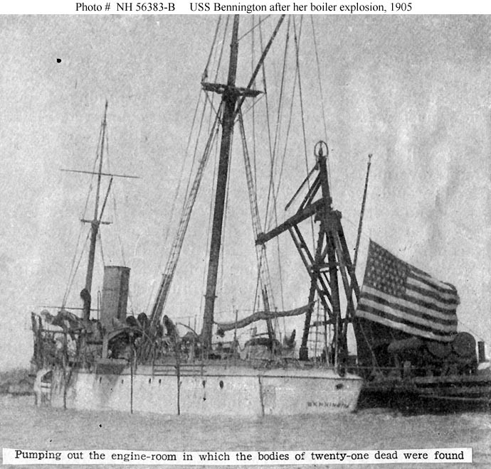 (Gunboat # 4) Halftone reproduction of a photograph, showing the ship as her engine room was being pumped out, soon after her 21 July 1905 boiler explosion at San Diego, California. Note her National Ensign flying at half-staff. Donation of Rear Admiral Ammen Farenholt, USN (Medical Corps), November 1931. U.S. Naval History and Heritage Command Photograph. Catalog #: NH 56383-B