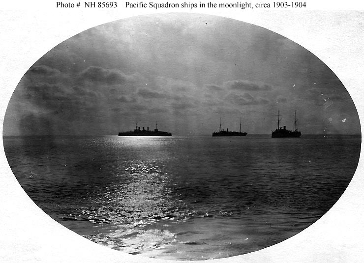 Ships of the squadron in the moonlight, during a Latin American cruise, circa 1903-1904. USS New York (Armored Cruiser # 2) is in the left center. The other two ships, listed in no particular order, are USS Concord (Gunboat # 3) and USS Bennington (Gunboat # 4). Donation of William L. Graham, 1977. U.S. Naval History and Heritage Command Photograph. Catalog #: NH 85693