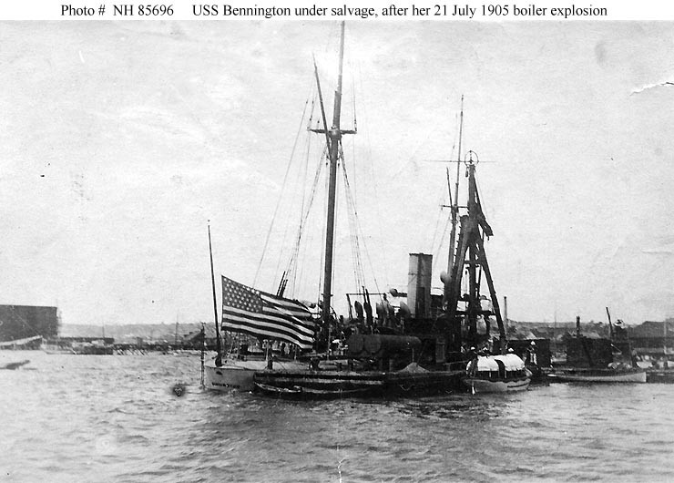 (Gunboat # 4) Salvage party at work on the partially sunken ship, in San Diego harbor, California, after her 21 July 1905 boiler explosion. Bennington’s National Ensign is flying at half-staff. Donation of William L. Graham, 1977. U.S. Naval History and Heritage Command Photograph. Catalog #: NH 85696