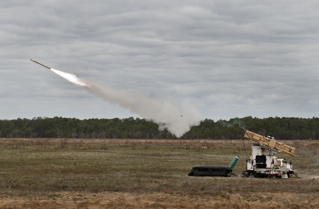 An AIM-92 Stinger missile is fired down-range from the US Army’s new Interceptor launch platform at the Eglin Air Force Base range March 23. The 96th Test Wing hosted the Army’s Stinger Based Systems and Raytheon for two days to demonstrate the new launch platform’s capabilities. The interceptor can hold up to four missiles and can be mounted and launched from a variety of ground vehicles.(Photo: Samuel King Jr./US Air Force)