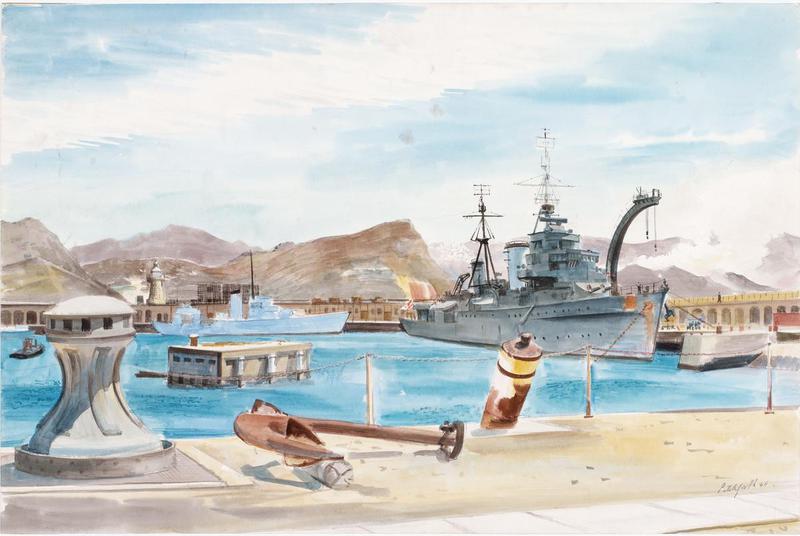Cruiser HMS Enterprise at Simonstown, South Africa: Christmas 1945. Enterprise (D52) was an obsolete 7500-ton WWI-era Emerald-class light cruiser brought out of retirement during WWII and used for escort duties and naval gunfire support, firing over 9,000 rounds on D-Day alone. Ironically, the old behemoth sank a German torpedo boat with a torpedo, which is something I didn’t know was even possible. When Pitchforth ran across her, she was in the last days of her service, helping return British troops from Asia and Africa before being broken up. Pitchford was in South Africa at this time recovering from his own war aliments. In many ways, when he painted this work, Pitchforth and Enterprise were the same.