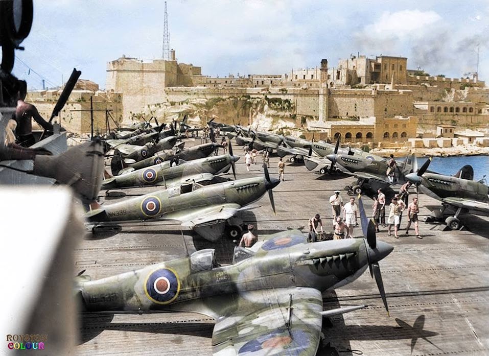 Supermarine Seafire L.IIIs of RNAS 808 Squadron on the deck of the escort aircraft carrier HMS Khedive (02), entering the Grand Harbour of Valletta in Malta. July 1944