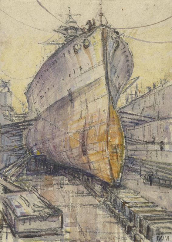 HMS Revenge in Dry Dock, Portsmouth, 1918. A view of the looming bow of the Royal Navy battleship HMS Revenge whilst undergoing maintenance in dry dock at Portsmouth. The huge ship is tethered to the dockside and supported against the side of the dock with large struts. The lower half of the hull, usually below the water level, is a rusty orange colour. Only the tallest part of the ship’s superstructure is visible at the top of the composition. The lead ship of her class of 5 30,000-ton modern battleships, Revenge was commissioned in 1916, just before the Battle of Jutland and survived both World Wars, going to the breakers in 1948. IWM 765