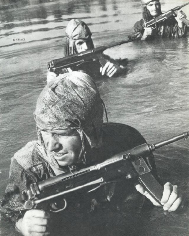 Yugoslav People`s Army soldiers crossing a river M56 Submachine guns. These Yugo-made room brooms were chambered in 7.62×25mm Tokarev and cheaply cloned from the classic German MP40