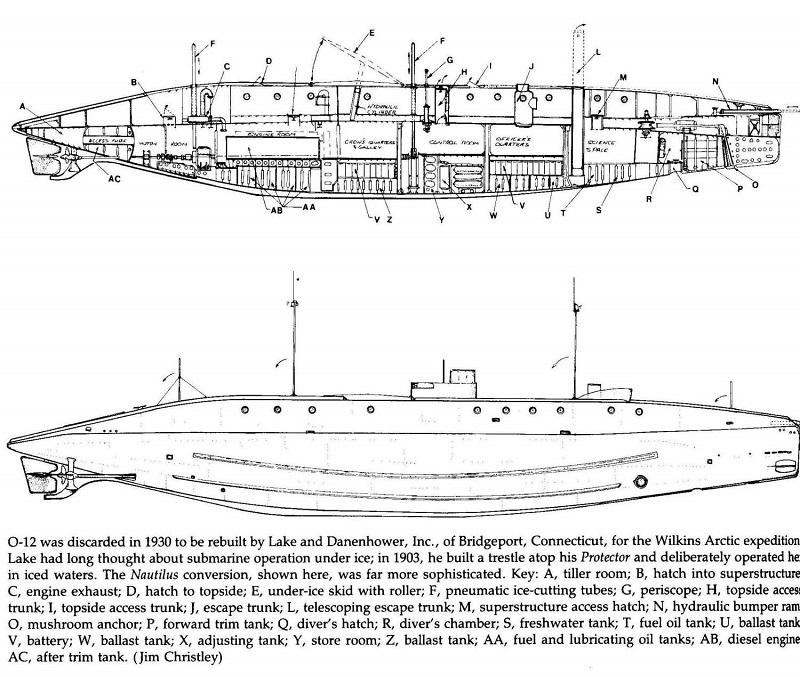O-12 (SS-73) was discarded in 1930 to be rebuilt by Lake & Danenhower Inc., of Bridgeport CT., for the Wilkins Artic expedition. Lake had long thought about submarine operations under ice; in 1903, he built a trestle atop his Protector and deliberately operated her in iced waters. The Nautilus conversion, shown here, was far more sophisticated. Drawing by Jim Christley, text courtesy of U.S. Submarines Through 1945, An Illustrated Design History by Norman Friedman. Naval Institute Press. Via Navsource
