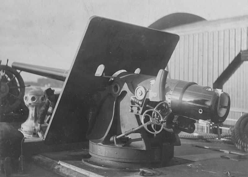 (Brazilian auxiliary cruiser, 1893-1898, formerly S.S. El Cid, later USS Buffalo) View on board, probably taken while fitting out for Brazilian Navy service in November 1893 at the Morgan Iron Works, New York City. The gun, which is mounted at the ship’s stern, is almost certainly a 4.7 quick-fire weapon built by the Hotchkiss Ordnance Co. U.S. Naval History and Heritage Command Photograph. Catalog #: NH 105944