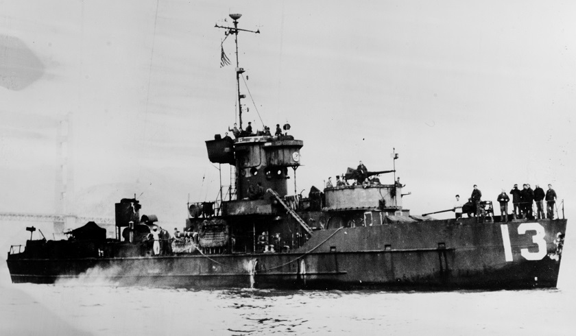 USS LCS(L)(3)-13 In San Francisco Bay, California, soon after the end of World War II. The Golden Gate Bridge is in the left background. Courtesy of William H. Davis, 1977. U.S. Naval History and Heritage Command Photograph. Catalog #: NH 85170