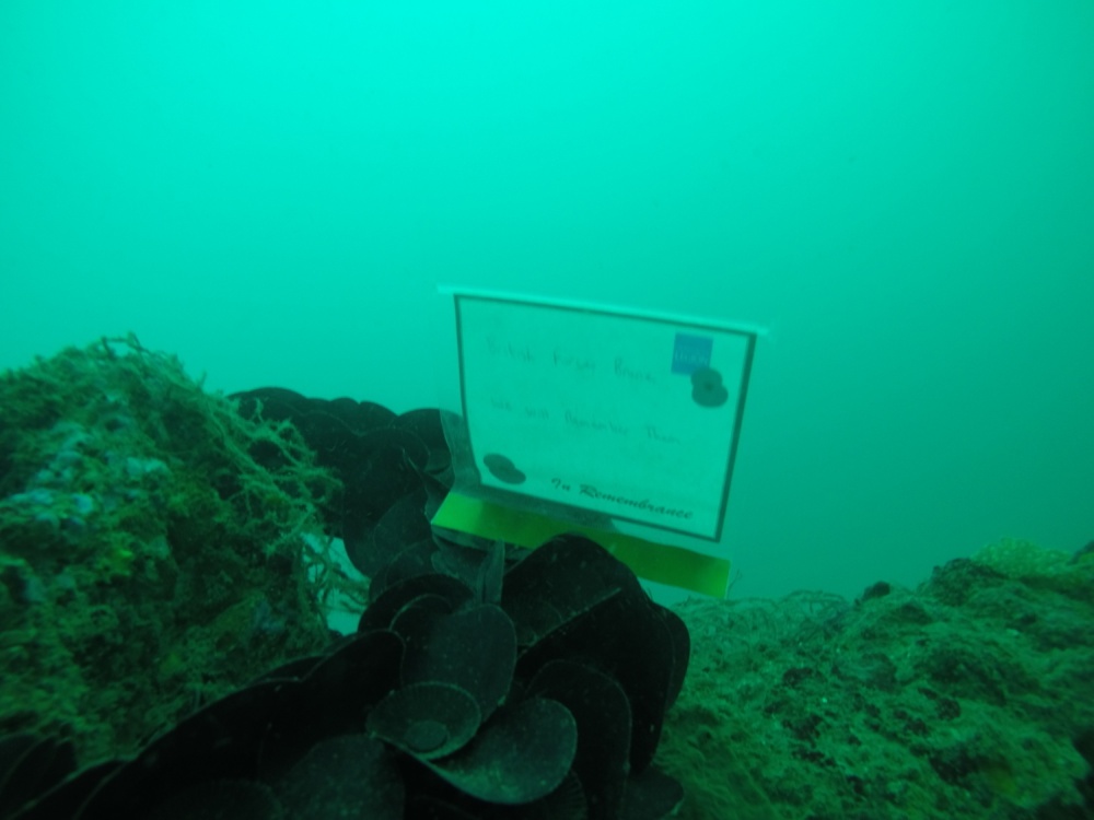 USS SALUTE (November 16, 2016) U.S. Navy Divers attached to Mobile Diving and Salve Unit ONE place a memorial plaque at the wreckage site of USS Salute (AM-294) which sank in Brunei waters on June 7, 1945, during Cooperation Afloat Readiness and Training (CARAT) Brunei 2016, Nov. 16. (U.S. Navy photo by Lt. Chris Price/RELEASED)