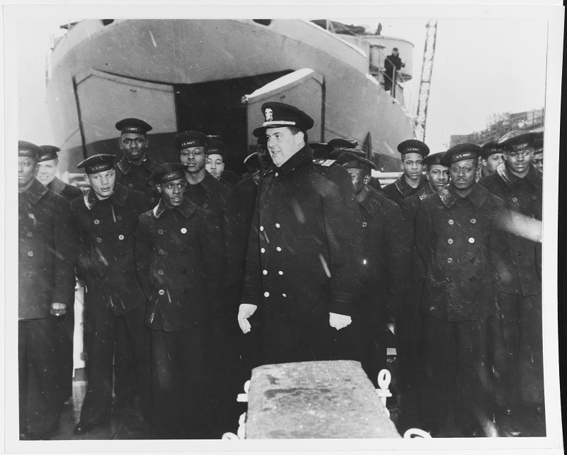 Commissioning ceremonies on the ship’s fantail, held in a driving snowstorm at the Boston Navy Yard, Massachusetts, 20 March 1944. Her Commanding Officer, Lieutenant Commander William M. Blackford, USNR, is in the center with some of the crew standing in ranks behind him. Ship in the background is an LST, with bow doors partially opened. Official U.S. Navy Photograph, now in the Collections of the National Archives. Catalog #: 80-G-218856