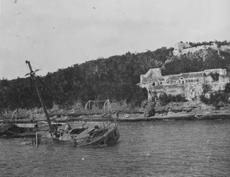 Wreck of REINA MERCEDES. Estrella Battery, Santiago, Cuba, 1898. From collection of Rear Admiral C.H. Taylor.
