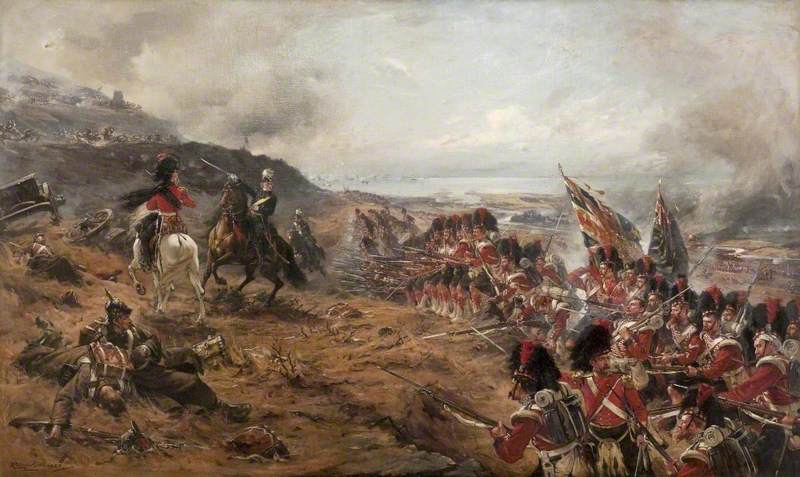 Alma: Forward the 42nd. This 1888 oil on canvas by Scottish artist, Robert Gibb (1845–1932), depicts the Battle of Alma, in Sebastopol, Crimea on the 20th September 1854. Black Watch, in full review order, are advancing towards enemy guns on heights above, with Field Marshal Sir Colin Campbell (later Lord Clyde) shown giving the historic order from which the painting is titled. In left foreground are two Russians, and in distance stretch of sea with fleet in action. The painting was gifted to Glasgow Museums collection by Lord Woolavington in 1923. Kelvingrove Art Gallery and Museum