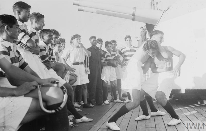 Wrestling, boxing and Physical Training during the dog watches. Copyright: © IWM. Original Source: http://www.iwm.org.uk/collections/item/object/205142572