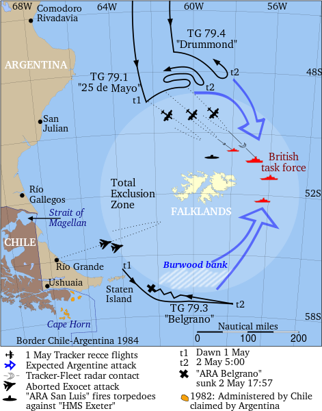 English: The image summarizes the deployment of Ar+Br naval forces around the Falklands Islands before the sinking of the ARA Belgrano during the Falklands War according to Ruben O. Moro with a hint that Middlebrook set the Argentine forces no more than 60-90 nautical miles from TEZ in opposite to Moro who set it further. Via Wiki