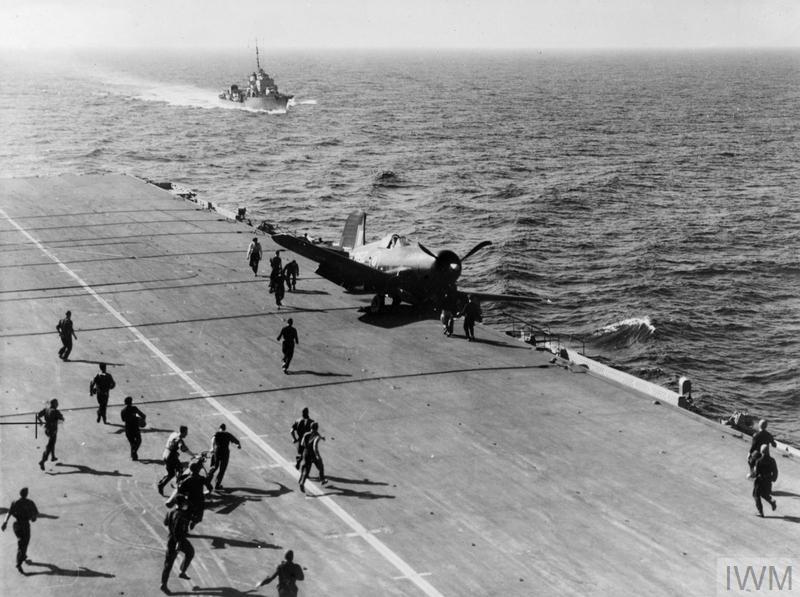 ON BOARD HMS VENERABLE IN THE MEDITERRANEAN. APRIL 1945, ON BOARD THE AIRCRAFT CARRIER HMS VENERABLE, FLAGSHIP OF THE 11TH AIRCRAFT CARRIER SQUADRON, IN THE MEDITERRANEAN. (A 28673) Fire and rescue party, with mobile foam extinguisher, double to the rescue when a Chance-Vought Corsair, though its hook had caught the first wire, nearly spills over the side. In the background is the attendant destroyer the Italian ORIANI steaming alongside ready to pick up crashed air crews. Copyright: © IWM. Original Source: http://www.iwm.org.uk/collections/item/object/205160011