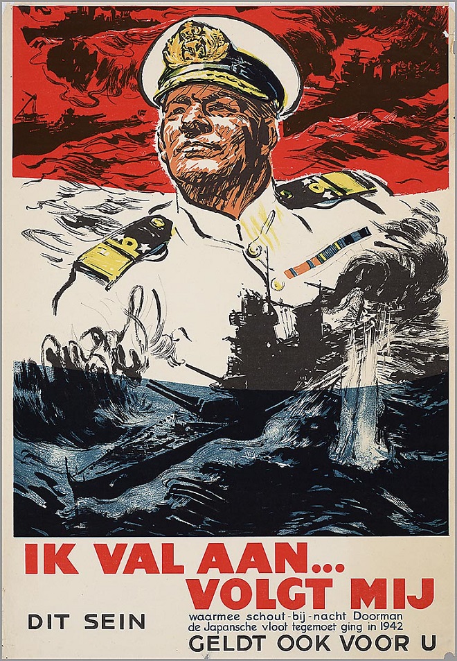 Dutch propaganda poster, depicting Admiral Karel Doorman and his flagship light cruiser De Ruyter