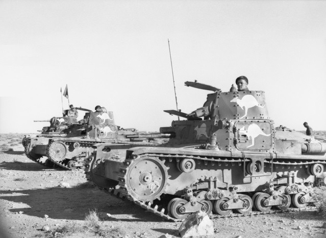 Australian soldiers with captured Italian Fiat M11 39 and M13 40 tanks in North Africa Tobruk, Libya – January 1941