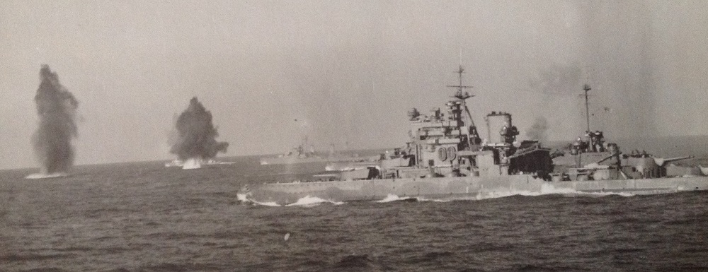 HMS Queen Elizabeth with the HMS Valiant. Italian bombs falling. 1941. Off Alexandria, Egypt.