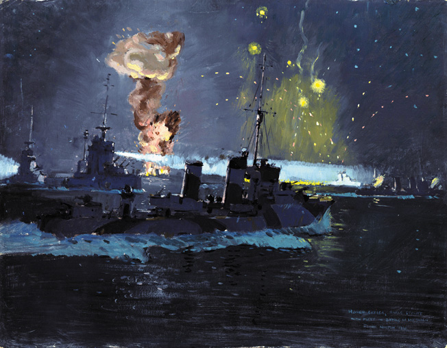 Artist Frank Norton painted this nightime scene of the Battle of Matapan. HMAS Stuart is in the foreground, HMS Havock at left, and two Italian Zara-class destroyers in the background. Radar gave the British the advantage during the night action.