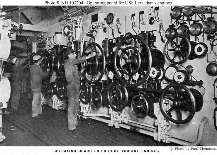 NH 103204 Posted on July 12, 2017 by laststandonzombieisland Leave a comment Halftone reproduction of a photograph taken in 1919, showing the operating board for the ship’s main propulsion steam turbines. Catalog #: NH 103204 Previous Next Return to Warship Wednesday, July 12, 2017: Woodrow’s biggest German