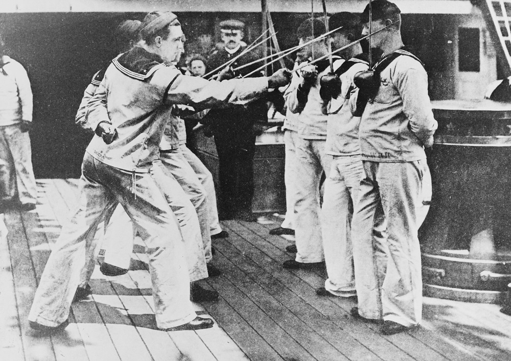 “Left face cut.” Cutlass exercises for apprentices on board USS MONONGAHELA at Newport, Rhode Island, circa June 1891. Halftone of a photo by Frank H. Child, Newport, Rhode Island. From the book: “U.S.T.S. Monongahela and the U.S. Naval Training System, illustrated,” 1892. Description: Catalog #: NH 45885