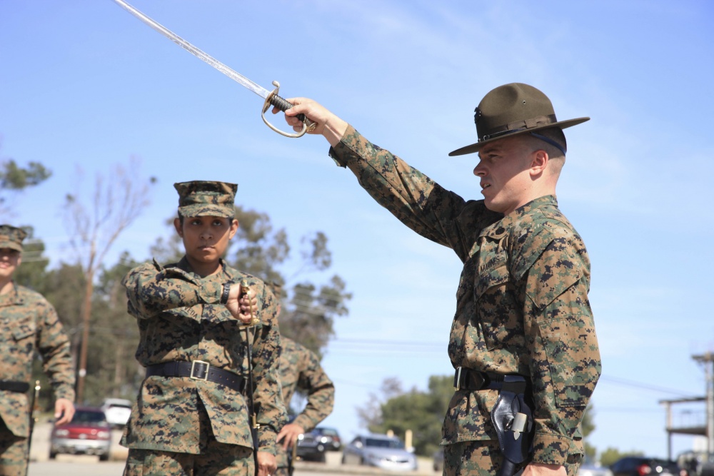 U.S. Marine Corps Staff Sgt. Joseph Bednarik, with Company E, 2nd Recruit Training Battalion, Marine Corps Recruit Depot San Diego, instructs Marines on proper sword manual during Corporals Course on Camp Pendleton, Calif., Feb 22, 2016. Sword manual is an honored tradition in which Marines command troop formations during formal ceremonies. (U.S. Marine Corps photo by Cpl. Brian Bekkala, MCIWEST-MCB CamPen Combat Camera/Released)