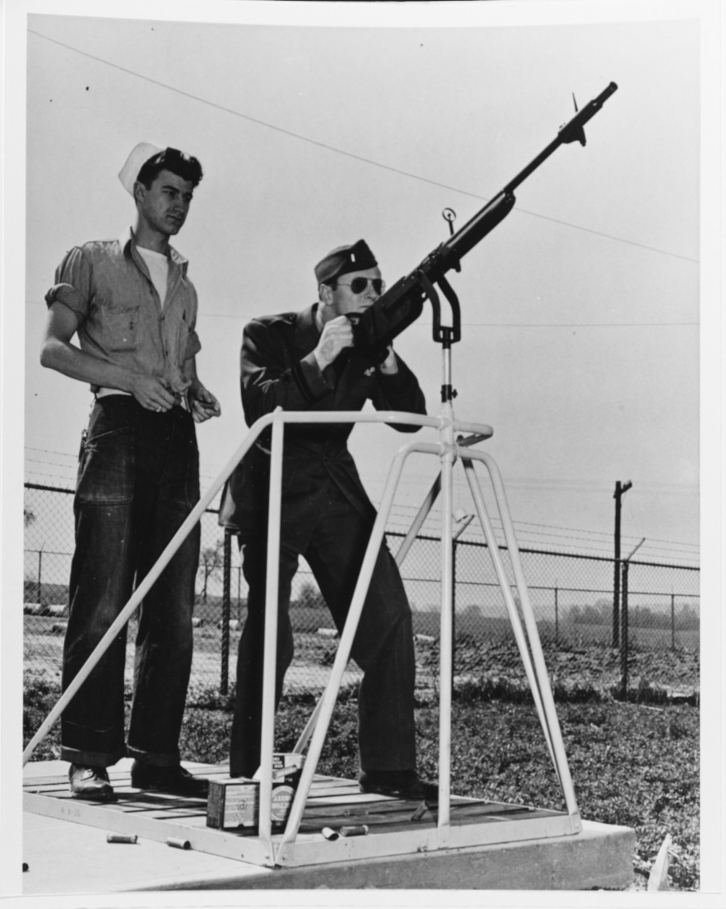 On the skeet range at N.A.S. Saint Louis, Missouri, 29 April 1944. Gunner is Lieutenant Junior Grade Rothschild, instructed by Martin. Shotgun is a Remington Model 11, 12 gauge semiautomatic, on a shotgun mount assembly Mk. 1 Mod. 0 consisting of gun mount adapter Mk. 12 mod.2 and .30 caliber stand Mk.23 Mod.0. Note boxes of Peters “Victor” brand skeet cartridges. Description: Catalog #: 80-G-237387