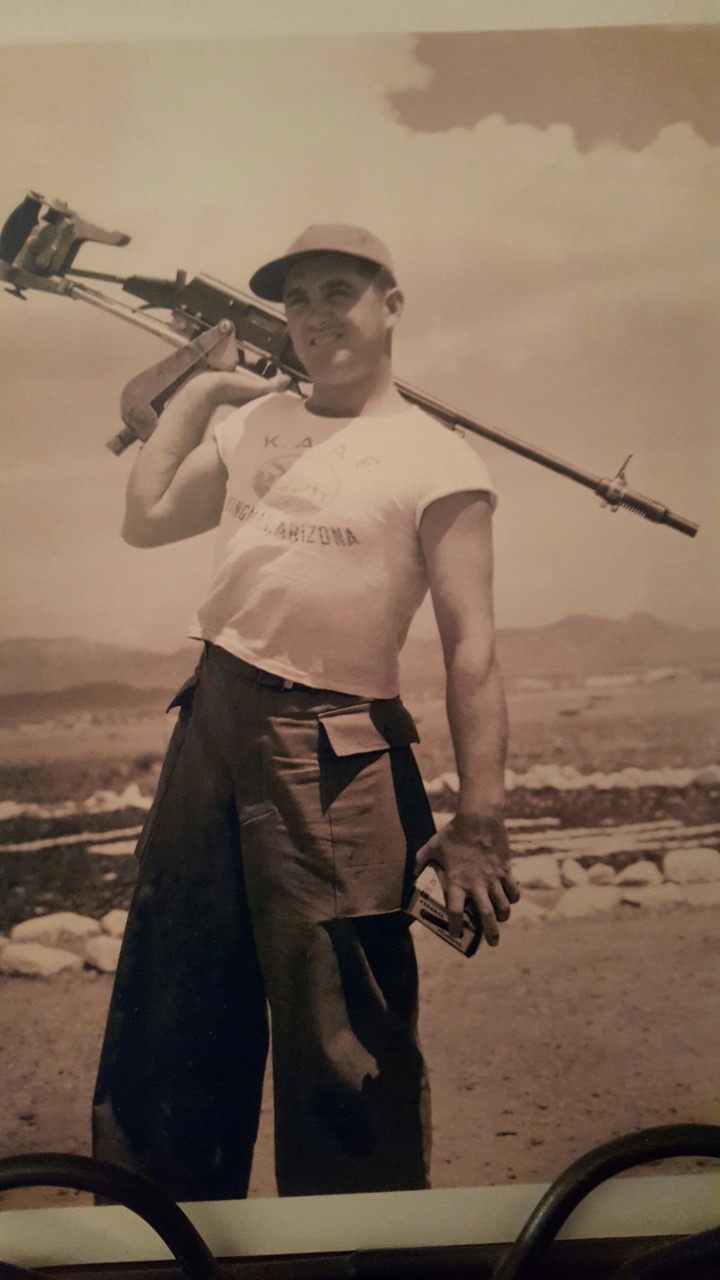 US gunner with a training weapon, a or Remington Model 11 set up to emulate flexible-mount .50 caliber M2 Browning