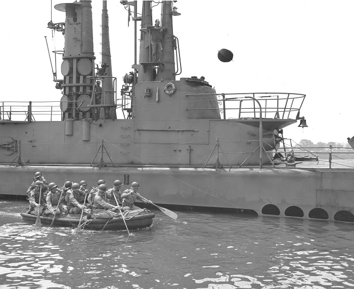 Marine Corps Amphibious Reconnaissance troops in LCR leave the submarine SEAGULL to perform a landing operation during maneuvers. OFFICIAL U.S. MARINE CORPS PHOTO 313892