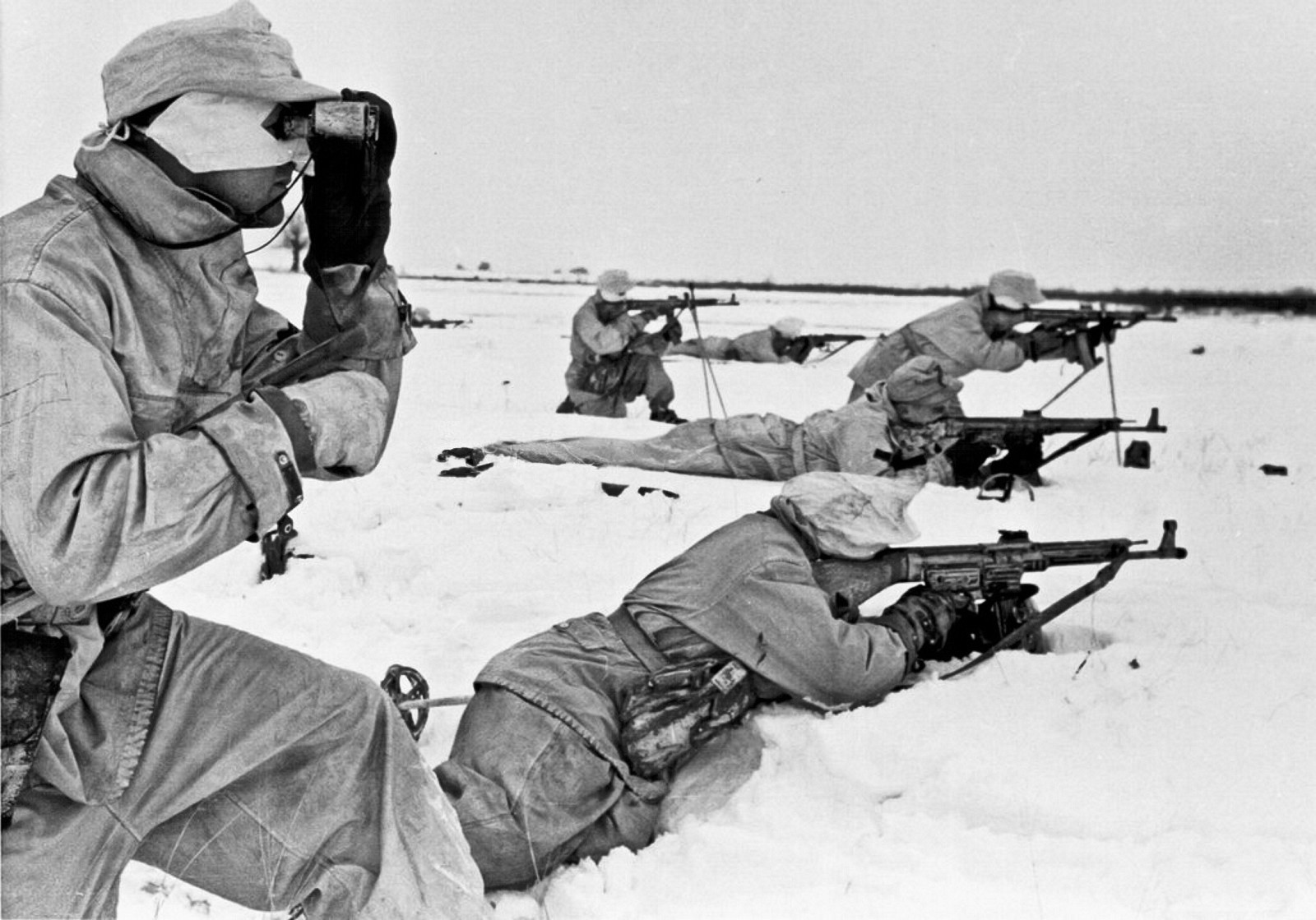 German soldiers from 1st Ski Division (1. Skijäger-Division) armed with StG 44 Sturmgewehr 44 in Pripyat, Ukraine, February, 1944