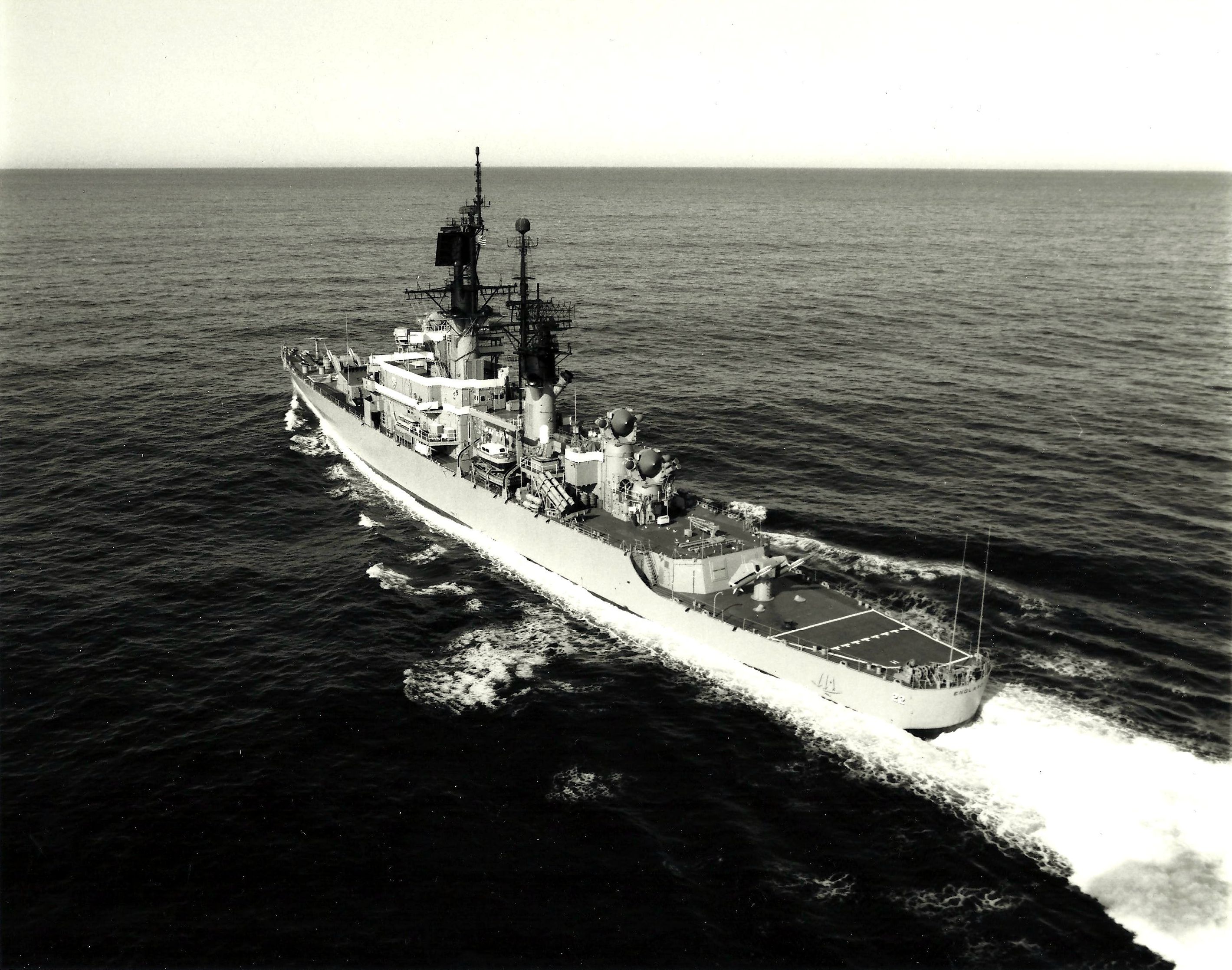 Leahy-class guided missile cruiser USS England (CG-22), Pacific Ocean, 10 January 1983. Note the retrofitted Harpoon anti-ship missiles aft