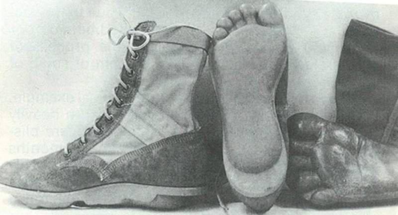 Boots from the US Special Forces units MACV SOG during the Vietnam War. They were designed to leave traces that look like footprints of peasants and to hide the movements of the teams.