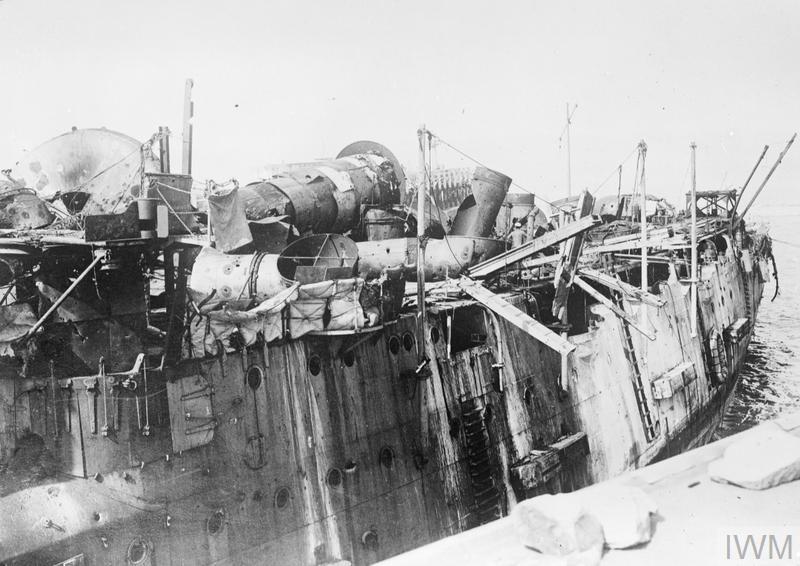 THE SECOND OSTEND RAID, MAY 1918 (Q 24031) Wrecked HMS Vindictive in the Ostend Harbour, May 1918. Copyright: © IWM. Original Source: http://www.iwm.org.uk/collections/item/object/205264348