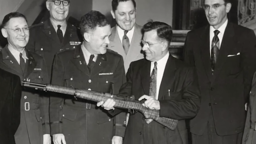Secretary of Army Robert Stevens presents John Garand with an M1 Garand rifle at his retirement in 1953. Note the deep grain in the walnut