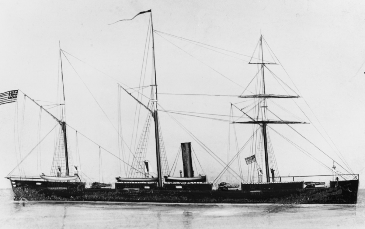 USS Monongahela artwork showing her as originally built, with three pivot guns and no bowsprit. This was her configuration until 1865. Later, she added a pair of 24-pounders as well as a matching set of 12-pounders to the list. NH 45205