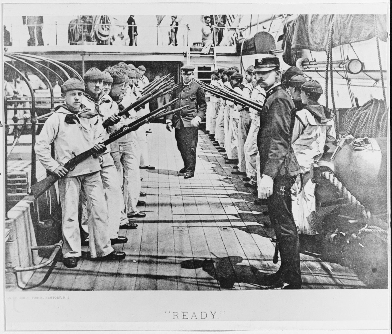 “Ready.” Apprentices of the Fourth Division at small arms drill, on board USS MONONGAHELA (1863-1908), at Newport, Rhode Island, circa June 1891. Halftone of a photo by Frank H. Child, Newport. Note: Hotchkiss rifles. NH 45886