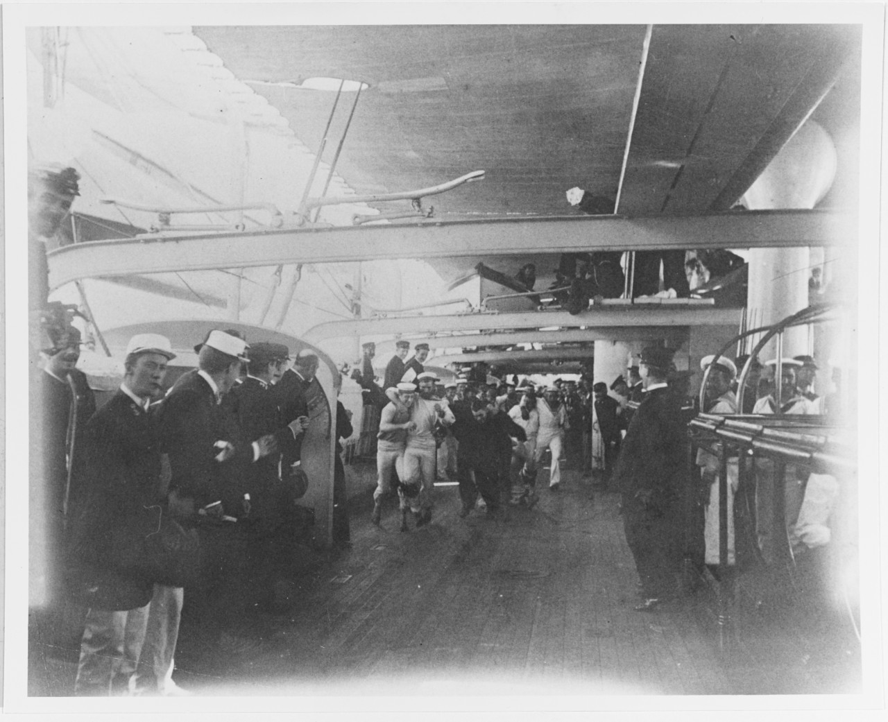 Three-legged race on board Charleston during Thanksgiving Day celebrations at Rio de Janeiro, Brazil, November 1893. Participants include British and German sailors. The onlookers appear to be of mixed nationalities, as well. Courtesy of Captain Henry F. Picking, 24 December 1893. U.S. Naval History and Heritage Command Photograph. NH 52452