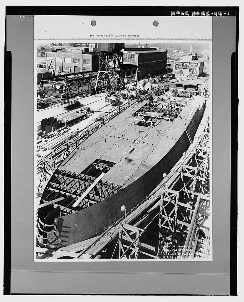 The Hughes Co., Photographers, Baltimore, Maryland 4 March 1943 Ironwood under construction at the U.S. Coast Guard shipyard in Curtis Bay, Maryland. Ironwood was the only 180 built by the U.S. Coast Guard. LOC HAER AK-44-1